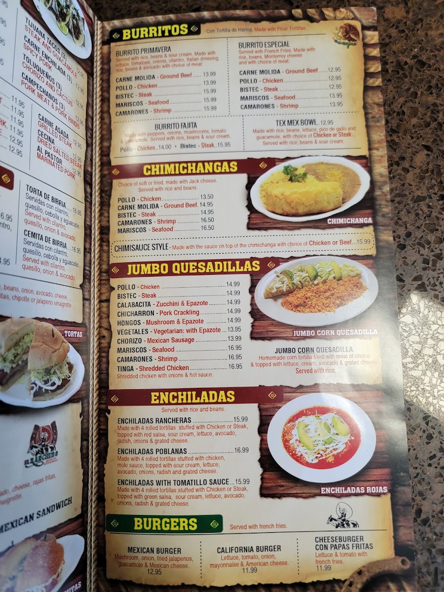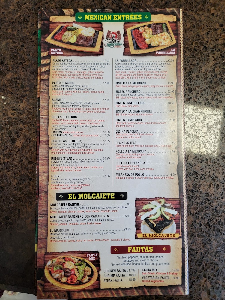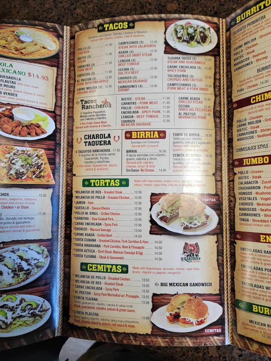 El Ranchero Mexican Restaurant offers a wide variety of flavorful dishes, providing a true taste of Mexican cuisine. Their menu features several standout options like Carne Asada Huaraches, Pollo Huaraches, and Cecina Huaraches, all offering a perfect combination of meats and savory toppings. For seafood lovers, there are options like Mojarra En Salsa Roja O Verde, Mojarra Frita, and Camarones Al Mojo De Ajo. If you're in the mood for something more hearty, their Molcajetes like the Molcajete Ranchero Con Camarones or Molcajete Marisquero are a must-try. The restaurant also has delicious Tex-Mex rice bowls such as the Steak Tex Mex Bowl and the Pollo Tex Mex Bowl. Tacos are a highlight as well, with choices like Lengua Rancheros and Pollo Rancheros for an authentic experience. For those craving a sandwich, the Torta Carne Asada and Torta Hawaiiana are delicious choices, while the Burrito Primavera Pollo and Burrito Primavera Bistec offer great options for burrito lovers. A variety of beverages like Mango Milkshake, Horchata Rice Drink, and refreshing Mexican Soda complement the meals perfectly. Don’t forget to save room for dessert, with tempting options like Pumpkin Spice Tres Leches and Churros With Ice Cream to end the meal on a sweet note. With so many flavorful choices, El Ranchero offers something for everyone!